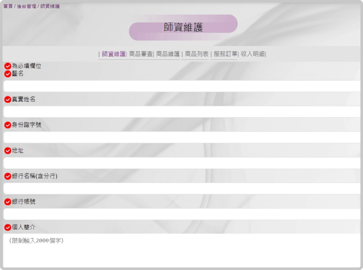 註冊方式二:掃描二維碼登入註冊,輸入個人完整資料,頁面最下面會出現我要加盟老師進行個人形象資料登錄,登入完成即會進入本公司管理後台進行審核與預約時間面談簽約。特別注意事項 必須要將LINE與帳號綁定連動,此作用為客戶下單通知作用。