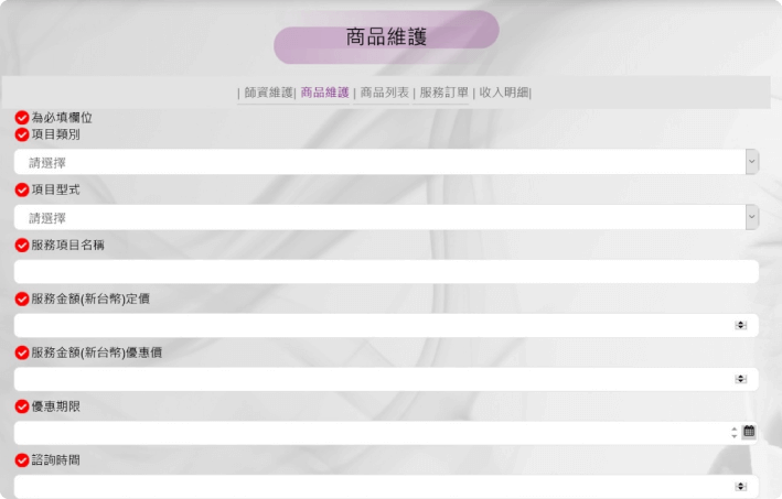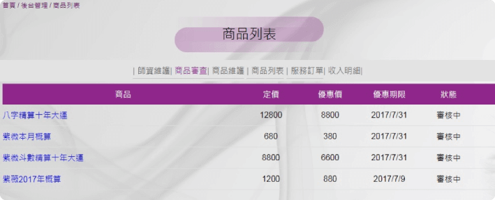 老師服務維護商品上架,當老師將服務商品上架後會進入公司後台審查,當審核完成則會立即在商城內出現。服務特價時間由老師訂定,其餘的內容異動將會先下架再一次審核後上架。每項服務都有時間設定,老師本身自己決定該服務時間長短,以分鐘為單位。