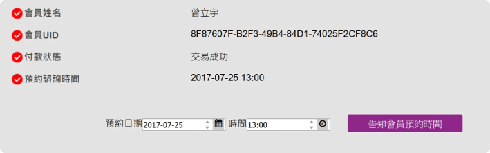 當通知會員後會傳送預定時間給會員,當會員時間可以時即會依約上線,時間不方便時會再重新傳送時間。