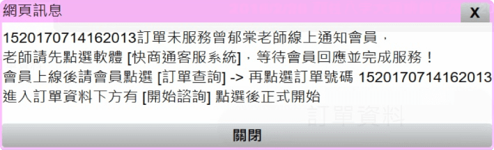 接收訂單完成會通過line通知,老師需依照會員指定時間上線或傳送約定時間通知會員經由本公司客服管理系統提供服務。
